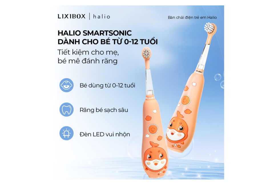 Bàn chải điện Halio Smartsonic Electric Kid Toothbrush là một sản phẩm mới mang tính đột phá được thiết kế đặc biệt cho trẻ từ 0 đến hơn 6 tuổi. Bàn chải điện có hình dạng như một chú cá heo màu cam vui vẻ, giúp bé thích thú hơn với việc đánh răng. Với tần số rung nhẹ nhàng hơn 2