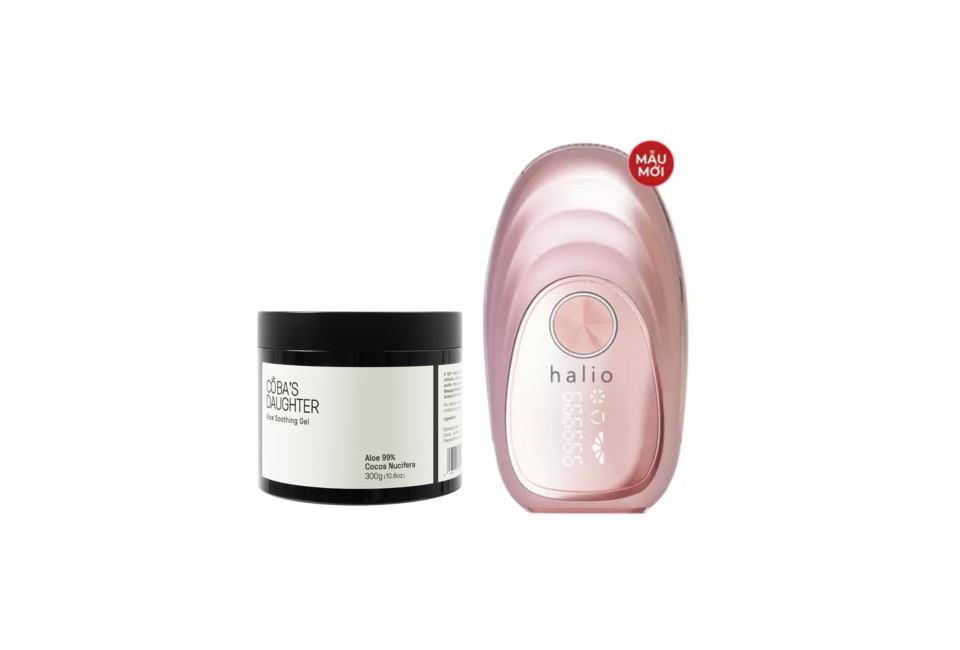 Box Bodycare Essentials Chăm Sóc Cơ Thể gồm 2 sản phẩm: Máy Triệt Lông Lạnh Cá Nhân Halio IPL Cooling Hair Removal Device và Gel Dưỡng Da Nha Đam Hương Dừa CoBa’s Daughter Aloe Soothing Gel 300gr