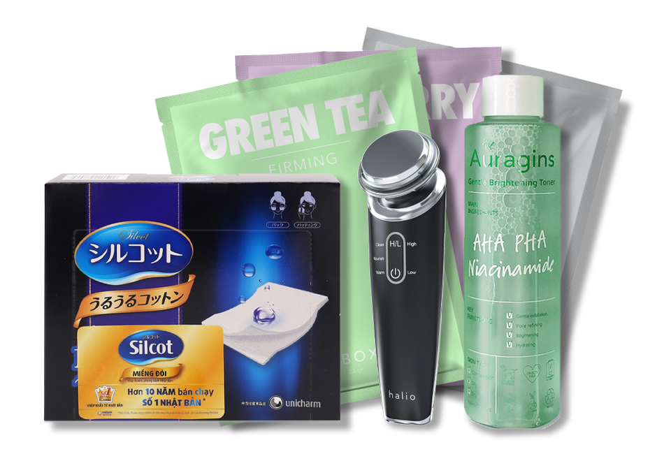 Box Sáng Da Mờ Thâm Ngừa Mụn Glass Skin Gồm: Máy đẩy tinh chất dưỡng trắng Halio Ion Cleansing & Moisturizing Beauty Device Black Nước Hoa Hồng The Auragins Gentle Brightening Toner 150ml Lixibox Daily Facial Mask Sheet - Acai Berry Lixibox Daily Facial Mask Sheet - Milk Lixibox
