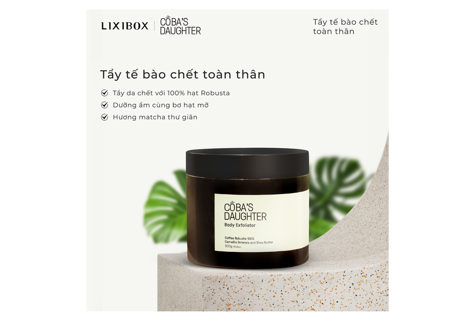 CÔBA’S DAUGHTER Body Exfoliator 300gr, sản phẩm tẩy tế bào chết toàn thân với hạt Robusta 100%, dưỡng ẩm bằng Camellia Sinensis và Shea Butter, hương matcha thuần khiết, giúp làn da mịn màng và khỏe mạnh.