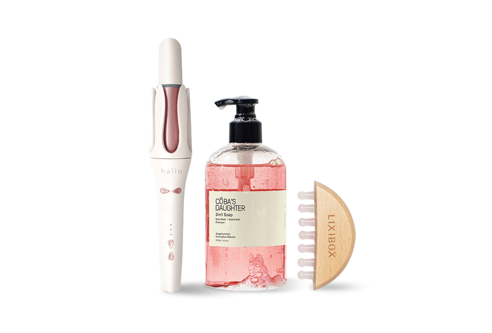 Combo Chăm sóc tóc mềm mượt Sun-Kissed & Confident Kit 1 gồm các sản phẩm sau: Máy Uốn Tóc Tự Xoay Ion Âm Halio instaCurl Premium Automatic Hair Styler Pearl White Lược Massage Đầu Đá Thạch Anh Hồng Lixibox Rose Quartz Head Massager Gel Tắm Gội, Tắm Bồn CoBa's Daughter Bodywash,