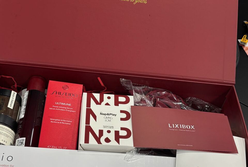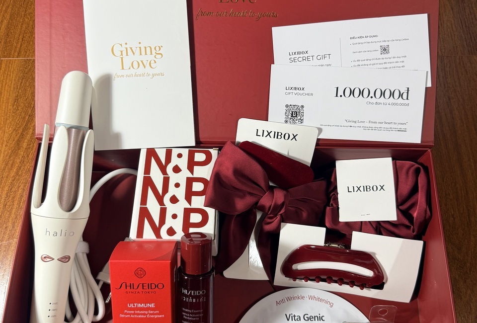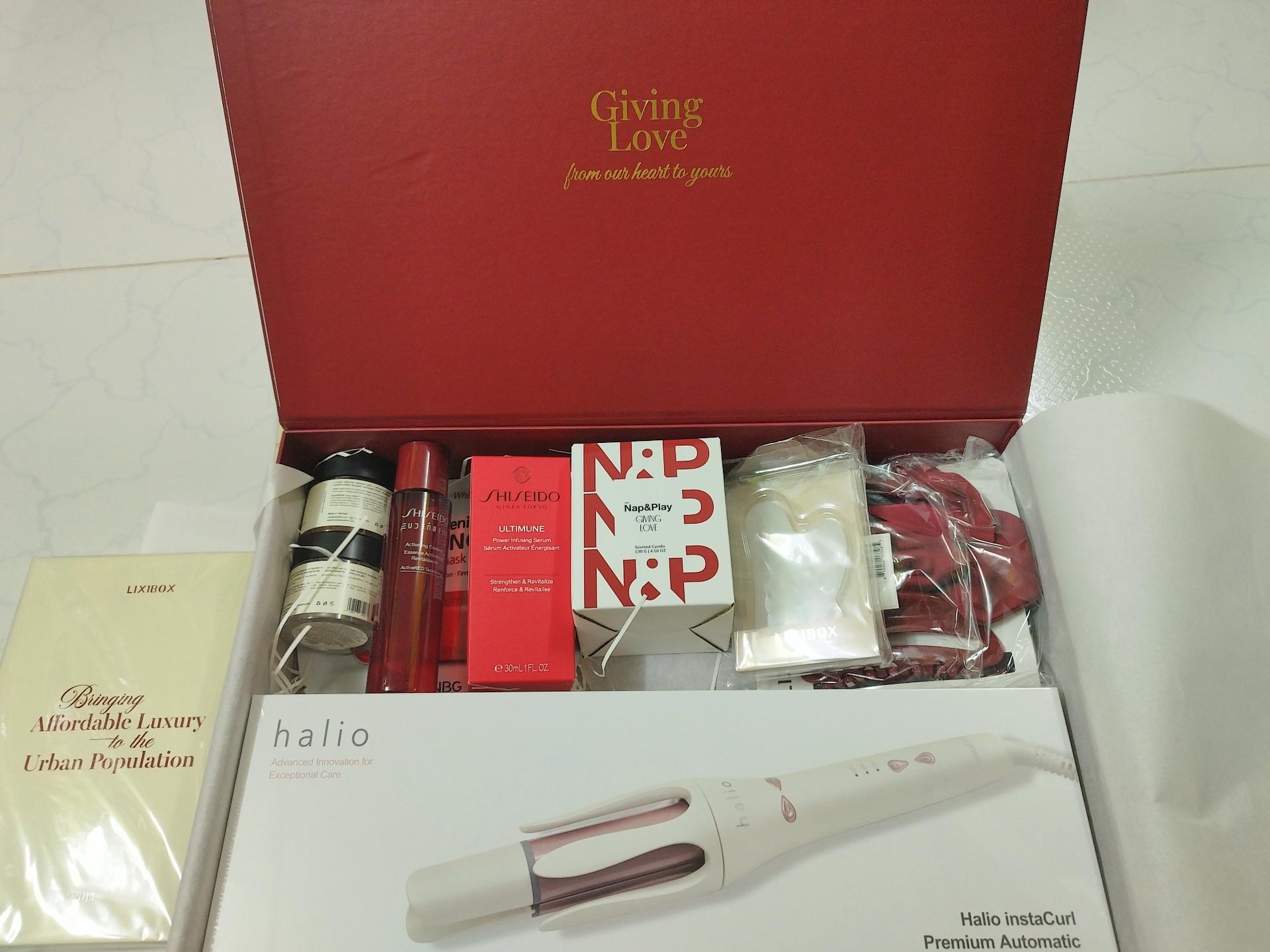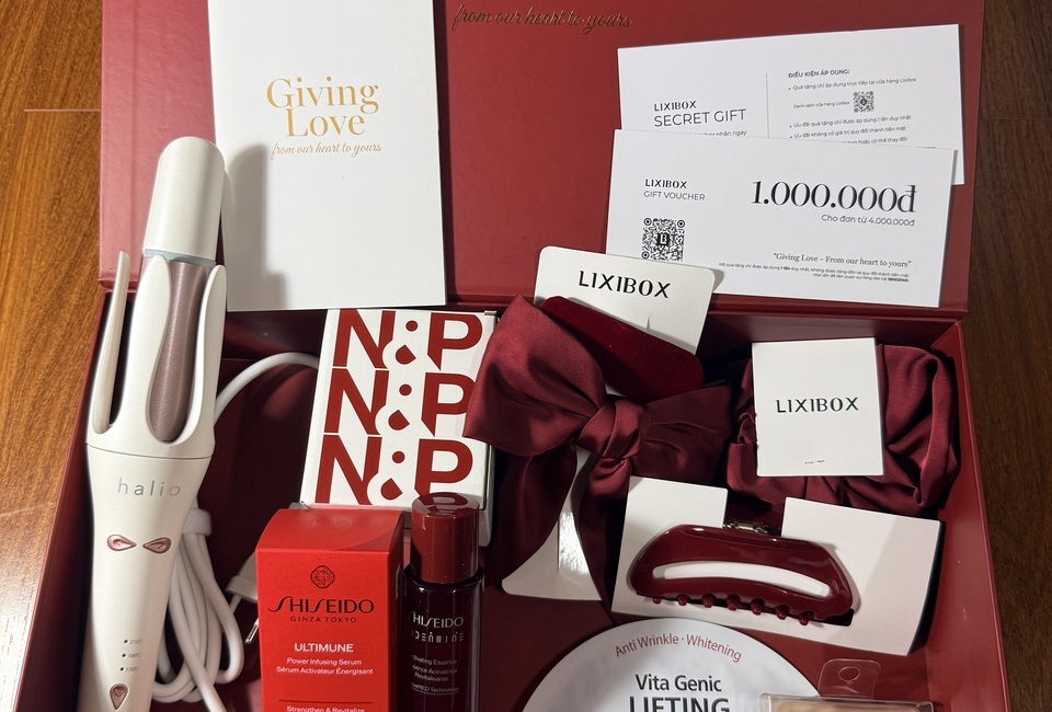 Giving Love – From our heart to yours” ------------------ 1. Máy Uốn Tóc Tự Xoay Ion Âm Halio InstaCurl Premium - Pearl White 2. Tinh Chất Shiseido Ultimune Power Infusing 30mL 3. Nước Thần Shiseido Eudermine 70ml 4. Gel Dưỡng Da nha đam hương dừa CoBa’s Daughter Aloe Soothing Gel 70gr 5. Tẩy Tế Bào Chết Toàn Thân Hương Trà Xanh CoBa’s Daughter Body Exfoliator 70gr 6,7,8,9. Bộ 4 Phụ Kiện Tóc Lixibox Rouge Hair Accessory Set 10. Nến Thơm Take Nap&Play Giving Love Candle 130g 11. Nước xịt thơm tóc & toàn thân Lixibox Hair & Body Fragrance Mist - Twilight Cedar 75ml 12. Voucher GWP LIXIBOX 13. Phiếu Quà Tặng Tại Cửa Hàng. "Quà có thể thay đổi theo từng thời điểm”